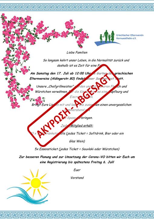 im Moment liegen dicke Wolken über Kornwestheim und es sieht nicht danach aus, dass sich die Wolken bis Samstag verziehen. Aus diesem Grund hat das Organisationsteam entschieden, das Sommerfest nicht stattfinden zu lassen. Wir danken den zahlreichen Mitgliedern, die sich angemeldet hatten und sich auch bereit erklärt hatten mit Kuchen/Salaten/Organisation der Feier zu unterstützen.