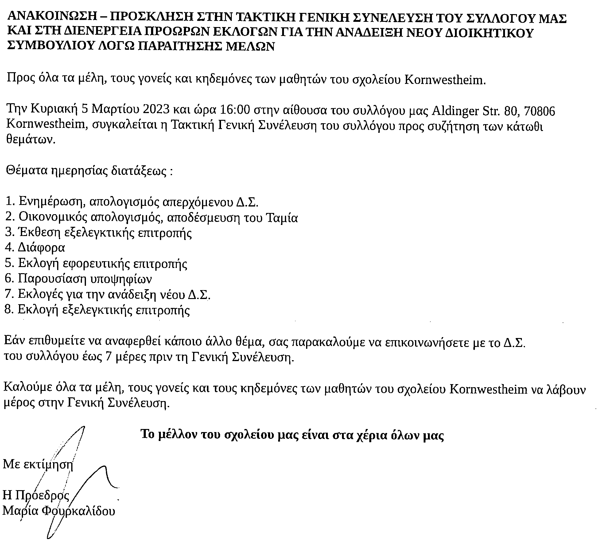 09/02/2023 ΠΡΟΣΚΛΗΣΗ ΣΤΗΝ ΤΑΚΤΙΚΗ ΓΕΝΙΚΗ ΣΥΝΕΛΕΥΣΗ ΤΟΥ ΣΥΛΛΟΓΟΥ ΜΑΣ ΚΑΙ ΣΤΗ ΔΙΕΝΕΡΓΕΙΑ ΠΡΟΩΡΩΝ ΕΚΛΟΓΩΝ ΓΙΑ ΤΗΝ ΑΝΑΔΕΙΞΗ ΤΟΥ ΝΕΟΥ ΔΙΟΙΚΗΤΙΚΟΥ ΣΥΜΒΟΥΛΙΟΥ ΛΟΓΩ ΠΑΡΑΙΤΗΣΗΣ ΜΕΛΩΝ